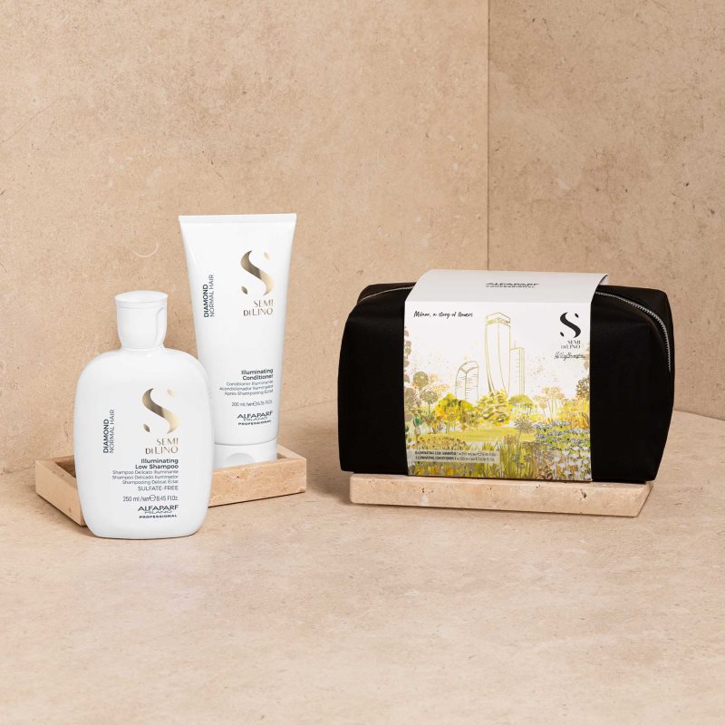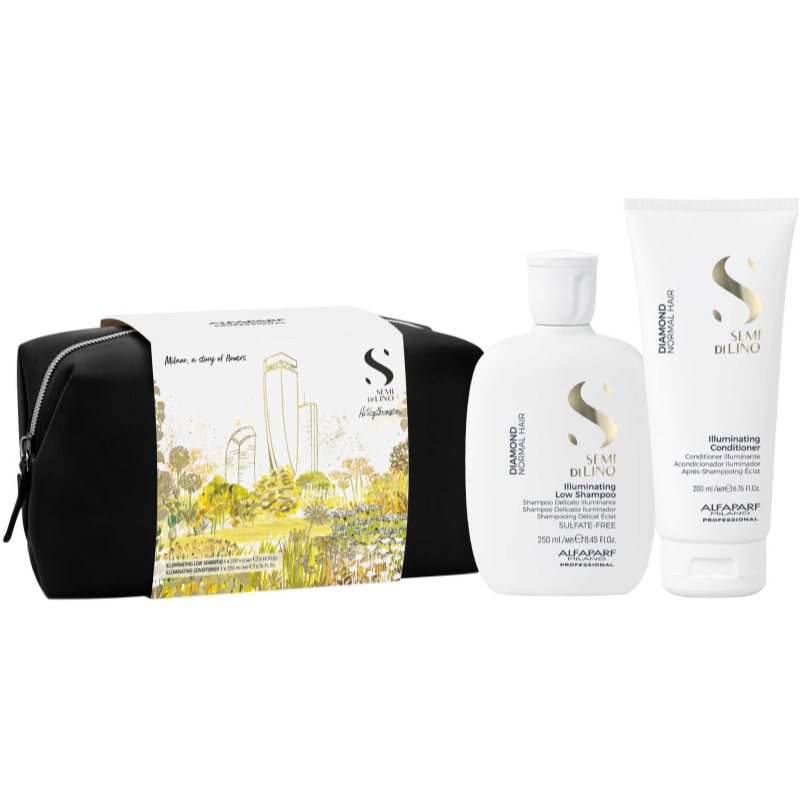 Alfaparf Milano Semi di Lino Diamond, 2 ks, Kosmetické sady pro ženy, Udělejte radost sobě nebo svým blízkým perfektním kosmetickým setem Alfaparf Milano Semi di Lino Diamond. Balíček plný vlasové péče jako dárek vždycky potěší. Sada obsahuje: Alfaparf Milano Semi di Lino Diamond Illuminating rozjasňující šampon pro normální vlasy 250 ml Alfaparf Milano Semi di Lino Diamond Illuminating rozjasňující kondicionér pro lesk a snadné rozčesávání vlasů 200 ml Alfaparf Milano kosmetická taška Vlastnosti: dodává lesk a objem regeneruje a vyživuje vlasy myje vlasy a čistí pokožku hlavy provoní vlasy jemnou vůní