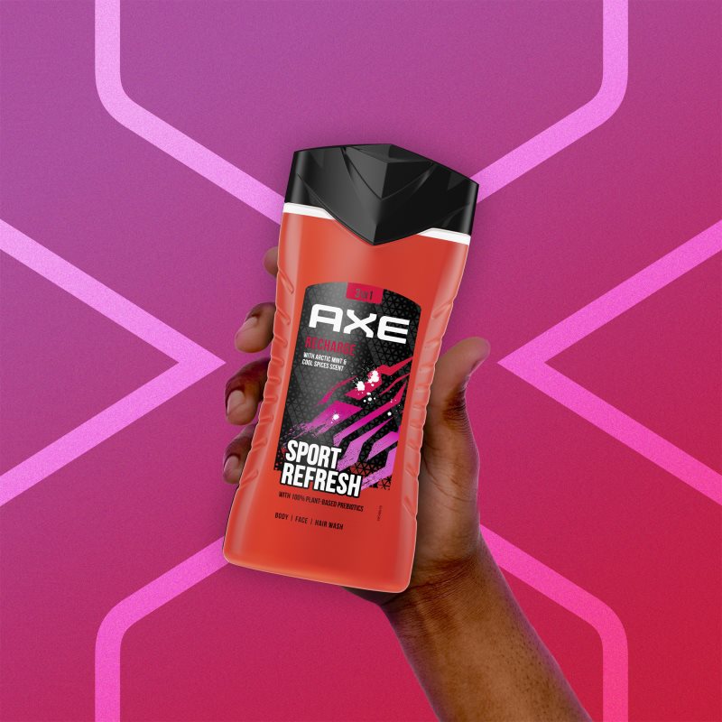 Axe Recharge Arctic Mint & Cool Spices, 400 ml, Sprchové gely a mýdla pro muže, Sprchový gel Axe Recharge Arctic Mint & Cool Spices učiní z nezbytné každodenní hygieny jedinečný osvěžující zážitek. Vlastnosti: šetrně myje pokožku celého těla po použití dodá pocit svěžesti a energie zvláčňuje a hydratuje lze použít na tělo i vlasy Jak používat: Naneste přípravek na vlhkou pokožku a smyjte veškeré nečistoty. Důkladně opláchněte.