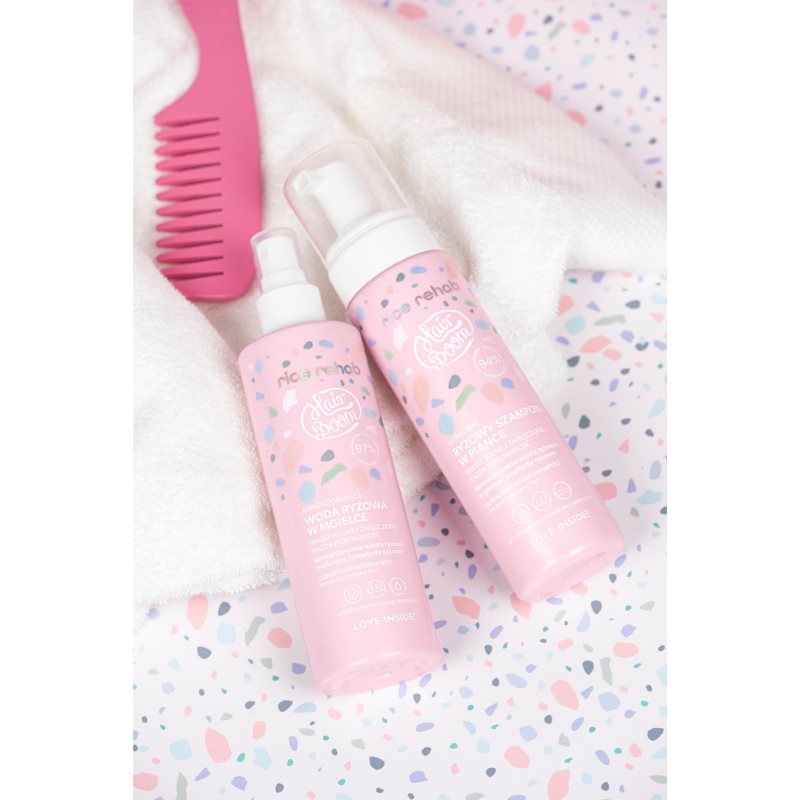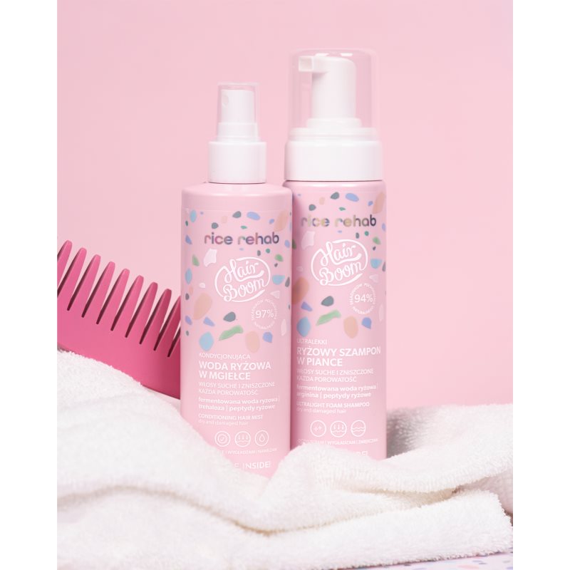BodyBoom HairBoom Rice Rehab Hair Mist, 200 ml, Spreje na vlasy pro ženy, Bezoplachová péče BodyBoom HairBoom dodá vašim vlasům po umytí vše, co právě potřebují. Vlastnosti: poskytuje vlasům hydrataci a výživu dodává přitažlivý lesk dodává sametovou hebkost působí proti krepatění vlasů příjemně provoní vlasy Složení: obsahuje minimálně 97 % složek přírodního původu Jak používat: Aplikujte na umyté a ručníkem prosušené vlasy. Neoplachujte.