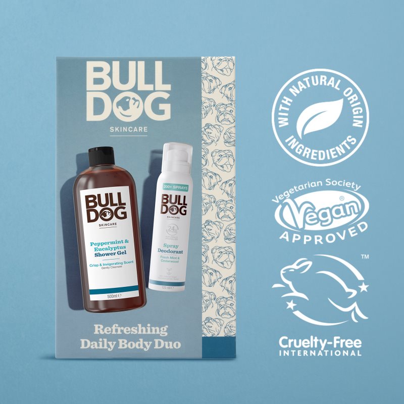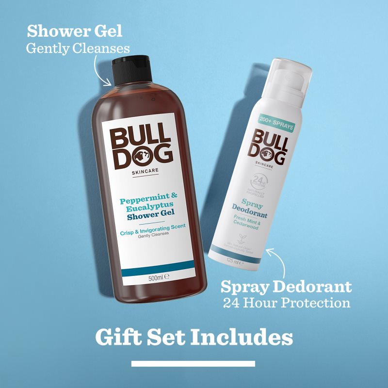 Bulldog Fresh Mint Duo, 2 ks, Pánské tělové sady pro muže, Udělejte radost kosmetickým setem Bulldog Fresh Mint, který je plný pánské kosmetiky pečující o tělo. Potěší každého moderního muže, který dbá o svůj zevnějšek. Sada obsahuje: Bulldog Peppermint & Eucalyptus Shower Gel sprchový gel pro muže 500 ml Bulldog Fresh Mint&Cedarwood Spray Deodorant deodorant ve spreji bez obsahu hliníku 125 ml Vlastnosti: myje pokožku a zbavuje nečistot intenzivně hydratuje navrací pokožce komfortní pocit příjemně voní potěší všechny muže dárkové balení Složení: vhodné pro vegany Jak používat: Každý produkt z kosmetického setu používejte dle jeho návodu na etiketě.