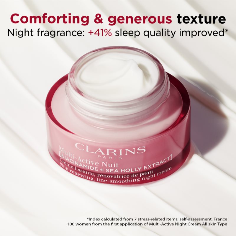 Clarins Multi-Active Night Cream Dry Skin, 50 ml, Pleťové krémy pro ženy, Nechcete podcenit péči o pleť? Používejte každý den hydratační krém – je to základ péče o pleť, bez kterého se běžná kosmetická rutina neobejde. Pleťový krém Clarins Multi-Active Night Cream Dry Skin dodá pleti potřebnou dávku hydratace, přinese úlevu od pocitu suchosti a zabrání tvorbě šupinek. Zanechá pleť v rovnováze, zvláčněnou, vyživenou a hebkou. Jeho hydratační účinky navíc pomůžou i v boji proti známkám stárnutí pleti. Vlastnosti: regeneruje a vitalizuje redukuje vrásky a předchází jejich vzniku dodává pleti svěžest a jas stahuje póry intenzivně hydratuje Jak používat: Aplikujte na vyčištěnou pleť a krouživými pohyby vmasírujte. Nechte vstřebat. Používejte pravidelně každý večer.