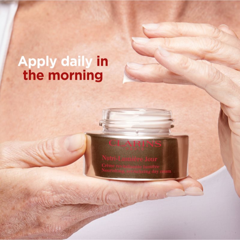 Clarins Nutri-Lumière Day, 50 ml, Pleťové krémy pro ženy, Nechcete podcenit péči o pleť? Používejte každý den pleťový krém – je to základ péče o pleť, bez kterého se neobejde běžná kosmetická rutina, ať už je zaměřená na jakýkoli typ pleti s jakýmikoli potřebami. Pleťový krém Clarins Nutri-Lumière Day podpoří přirozené kožní funkce, pomůže udržet pleť hydratovanou a v rovnováze a přispěje k celkově zdravějšímu vzhledu. Vlastnosti: hloubkově vyživuje dodává pleti svěžest a jas omlazuje pleť a dodává jí energii regeneruje a vitalizuje Jak používat: Naneste na očištěnou pleť a vmasírujte krouživými pohyby. Aplikujte na tvář, krk i dekolt. Používejte pravidelně každé ráno.
