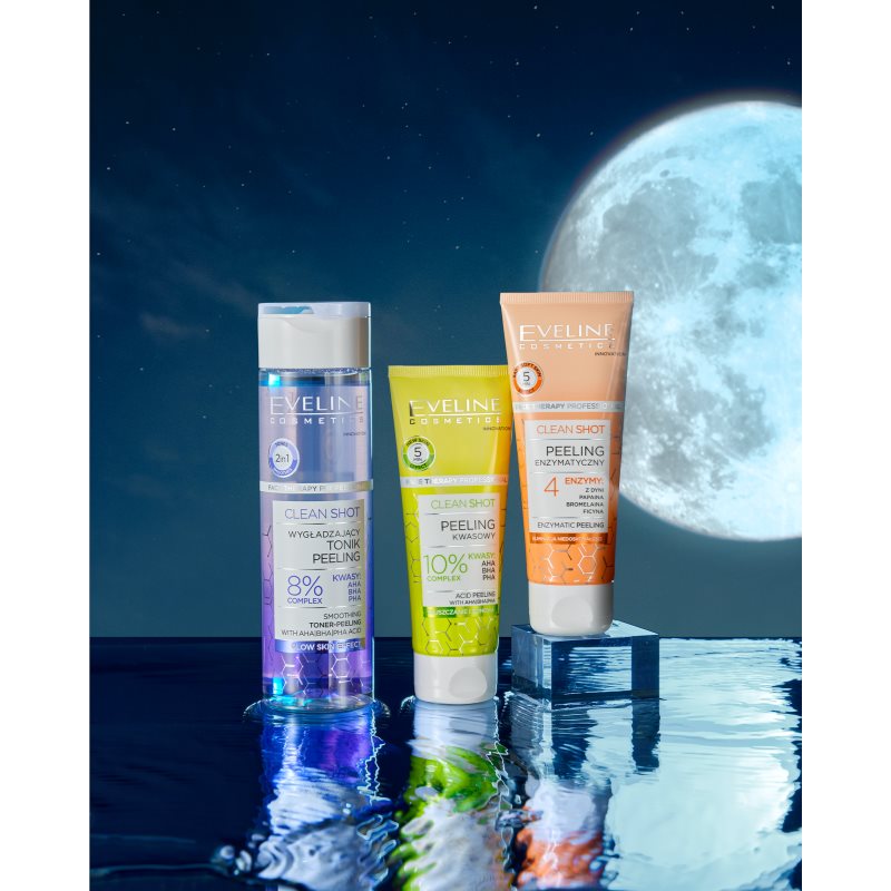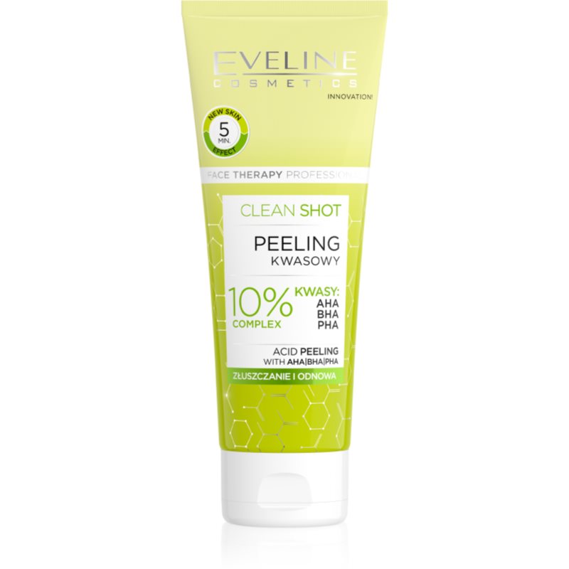 Eveline Cosmetics Clean Shot 10% Complex of AHA, BHA and PHA, 75 ml, Chemické peelingy pro ženy, Pro účinnou exfoliaci předcházející vzniku neokonalostí pleti nemusíte chodit do kosmetického salonu. Pleťový peeling Eveline Cosmetics Clean Shot 10% Complex of AHA, BHA and PHA se o ni postará v pohodlí vašeho domova. Nejen že odstraní odumřelé kožní buňky, které mají tendenci ucpávat póry, způsobovat černé tečky či mdlý tón a zašedlost pleti, ale také zbaví pleť nečistot a celkově ji vyhladí. Vlastnosti: odstraňuje odumřelé kožní buňky čistí ucpané póry nevysušuje pleť redukuje nedokonalosti pleti Složení: kyselina hyaluronová – váže na sebe velké množství vody a intenzivně hydratuje veganský produkt Jak používat: Naneste na suchý obličej, jemně masírujte a poté pečlivě opláchněte vodou. Používejte 1–3× týdně.