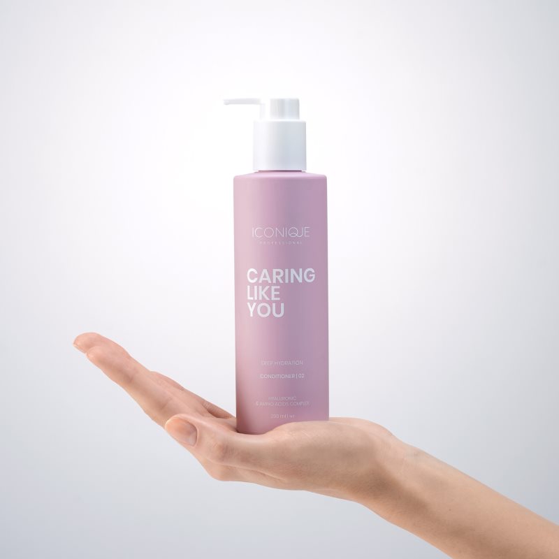 ICONIQUE Professional CARING LIKE YOU Deep Hydration Conditioner 250ml, 250 ml, Kondicionéry na vlasy pro ženy, Při mytí vlasů šampon otevírá povrchovou vlasovou strukturu – kutikulu. Proto je důležité dodat po mytí vlasům péči, která kutikulu opět uzavře. A právě o to se postará kondicionér ICONIQUE Professional CARING LIKE YOU Deep Hydration Conditioner 250ml. Kromě uzavření vlasových vláken zajistí jejich výživu, hydrataci a změkčení, bez čehož se krásné, lesklé a zdravé vlasy neobejdou. Ochrání je před mechanickým poškozením a vysušením, dále vyhladí jejich povrch a pomůže je zjemnit, což usnadní jejich rozčesávání a další úpravy. Vlastnosti: uhlazuje a působí proti krepatění usnadňuje rozčesávání a následnou úpravu poskytuje potřebnou hydrataci chrání před negativními dopady vnějšího prostředí