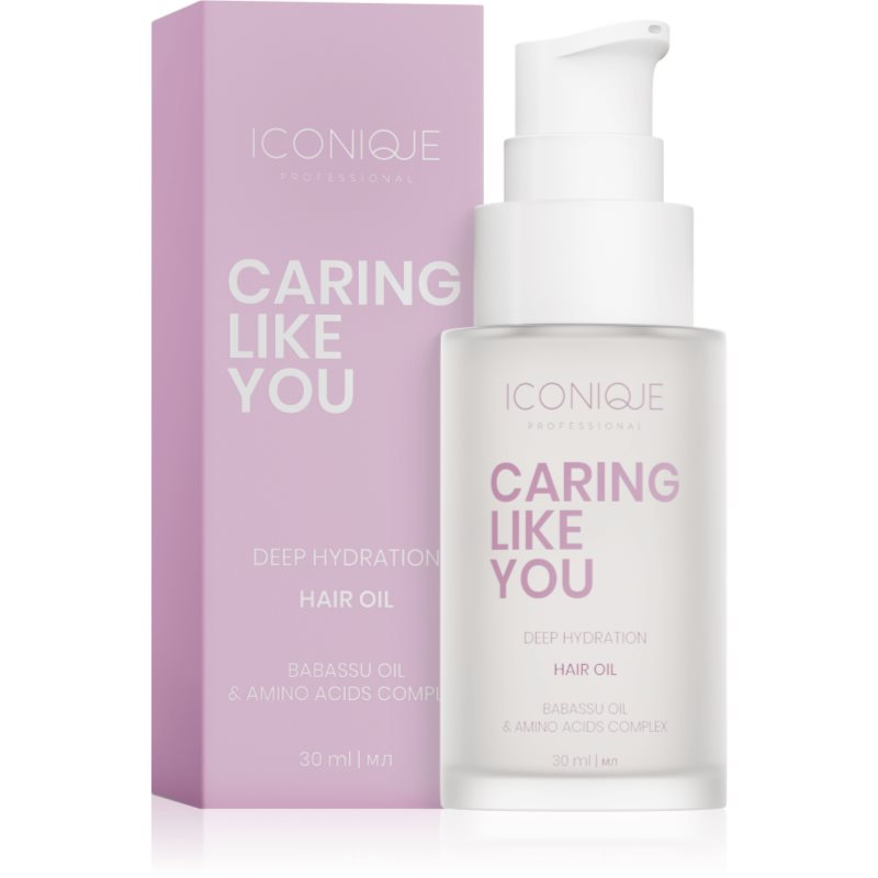 ICONIQUE Professional CARING LIKE YOU Deep Hydration Hair Oil 30 ml, 30 ml, Klasické vlasové oleje pro ženy, Máte pocit, že vaše vlasy potřebují něco víc, než jen péči poskytnutou šamponem, kondicionérem či třeba maskou? Klasický vlasový olej ICONIQUE Professional CARING LIKE YOU Deep Hydration Hair Oil 30 ml skvěle obohatí vaši pečující rutinu – dodá vlasům extra dávku výživy, pomůže obnovit jejich pružnost, ohebnost a celkovou flexibilitu, podpoří jejich regeneraci a v neposlední řadě se postará o vyhlazení jejich povrchu. Výsledkem tak budou hebčí, jemnější a zdravě lesklé vlasy s menší tendencí ke krepatění. Vlastnosti: dodává vlasům lesk dodává vlasům sametovou hebkost hloubkově vlasy vyživuje chrání vlasy před nepříznivými vnějšími vlivy krásně voní usnadňuje rozčesávání