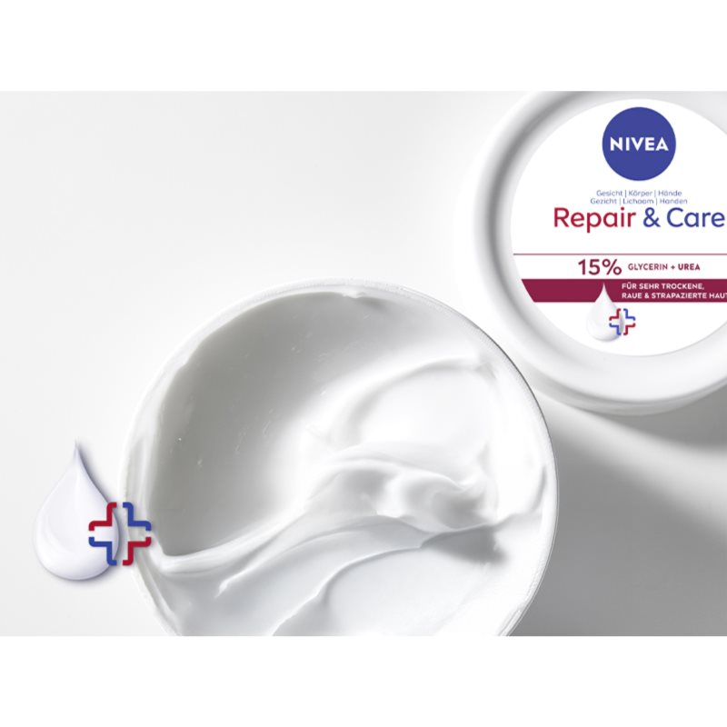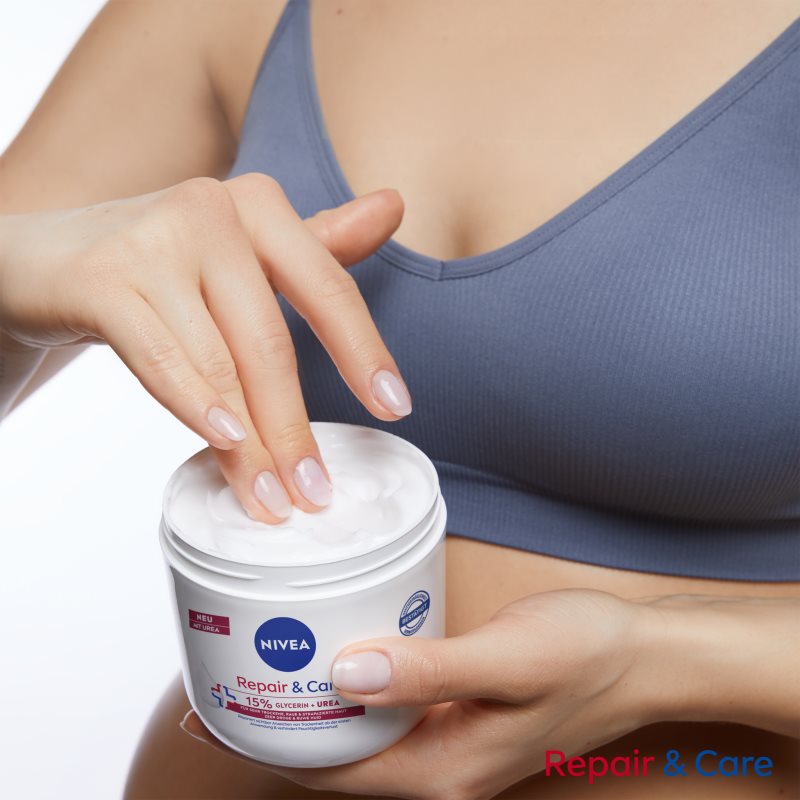 NIVEA Repair & Care Urea, 400 ml, Tělové krémy pro ženy, Cítíte, že vaše pokožka potřebuje trochu intenzivnější péči než tu poskytnutou tělovým mlékem? Postará se o ni tělový krém NIVEA Repair & Care Urea, který vyniká hutnou konzistencí a schopností dlouhodobě hydratovat i vyživovat. Pokožce celého těla dodá potřebnou jemnost a výživu, bude ji hýčkat svou krémovou texturou a zanechá ji chráněnou před nežádoucím vysušováním. Vlastnosti: hydratuje a vyživuje pokožku regeneruje napravuje suchou pokožku pro použití na tělo i obličej Jak používat: Aplikujte kdykoli během dne.