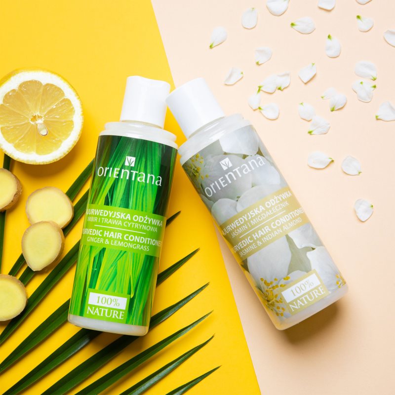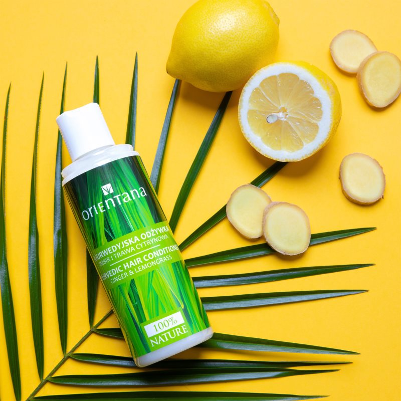 Orientana Ayurvedic Conditioner Ginger & Lemongrass, 210 ml, Kondicionéry na vlasy pro ženy, Při mytí vlasů šampon otevírá povrchovou vlasovou strukturu – kutikulu. Proto je důležité dodat po mytí vlasům péči, která kutikulu opět uzavře. A právě o to se postará kondicionér Orientana Ayurvedic Conditioner Ginger & Lemongrass. Kromě uzavření vlasových vláken zajistí jejich výživu, hydrataci a změkčení, bez čehož se krásné, lesklé a zdravé vlasy neobejdou. Ochrání je před mechanickým poškozením a vysušením, dále vyhladí jejich povrch a pomůže je zjemnit, což usnadní jejich rozčesávání a další úpravy. Vlastnosti: usnadňuje rozčesávání a následnou úpravu poskytuje potřebnou hydrataci zajišťuje vlasům oslnivý lesk Složení: obsahuje minimálně 99 % složek přírodního původu veganský produkt Jak používat: Aplikujte na šamponem umyté vlasy. Nechte chvíli působit a poté důkladně opláchněte.
