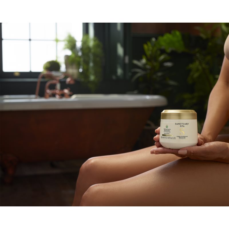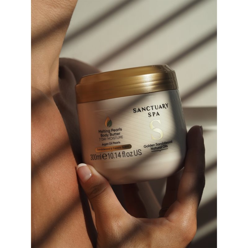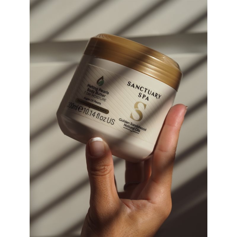 Sanctuary Spa Golden Sandalwood, 300 ml, Tělová másla pro ženy, Máte pocit, že vaše pokožka potřebuje intenzivnější péči než tu, kterou jí jsou schopná poskytnout tělová mléka či krémy? Tělové máslo Sanctuary Spa Golden Sandalwood je pro vás ideální volbou. Oproti běžným krémům a mlékům obsahuje méně vody, má hutnější konzistenci, a představuje tak výživnější a koncentrovanější péči o tělo. Pokožku hloubkově hydratuje, velmi intenzivně vyživuje a zanechává ji nádherně hebkou na dotek. Navíc ji hýčká svou sametově krémovou texturou a zajišťuje dlouhodobý efekt. Stačí jej nanést na kůži po sprše či koupeli a z běžné denní hygieny se rázem stane nevšední zážitek. Vlastnosti: příjemně voní hloubkově hydratuje pokožku zanechává pokožku na dotek sametově jemnou Složení: veganský produkt Jak používat: Aplikujte po sprše nebo koupeli na ještě vlhkou pokožku těla. Používejte ráno a/nebo večer na celé tělo.