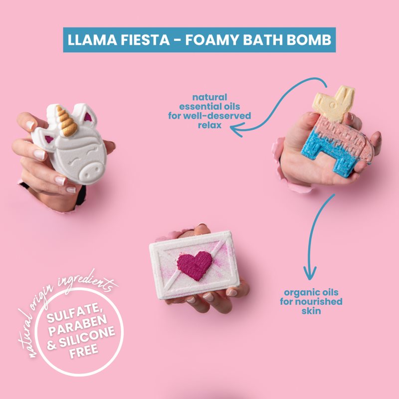 Soaphoria Bath Bomb Llama Fiesta, 85 g, Bomby do koupele pro ženy, Máte rádi dlouhé koupele v horké vodě? Vytvořte si lázně přímo u sebe doma. Šumivá koule do koupele Soaphoria Bath Bomb Llama Fiesta vám po dlouhém dni zajistí zasloužený relax. Při rozpouštění ve vodě uvolní jemné bublinky, a promění tak koupel v uvolňující rituál, který z vás odplaví stres a zanechá vaše tělo i mysl v harmonii. Vlastnosti: příjemně voní zajišťuje pocit komfortu a klidu zjemňuje pokožku celého těla uklidňuje tělo i mysl Jak používat: Přidejte do horké vody a nechte napěnit.