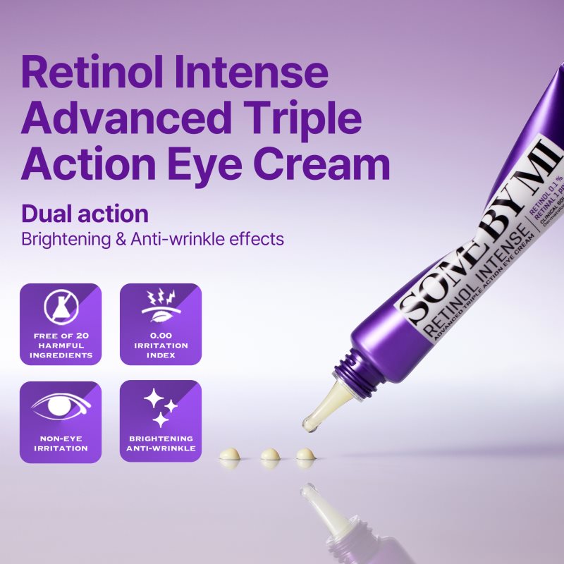 Some By Mi Retinol Intense Advanced Triple Action Eye Cream, 30 ml, Oční krémy a gely pro ženy, Oční péče Some By Mi Retinol Intense ošetřuje pleť očního okolí a dodává jí potřebnou výživu a hydrataci. Vlastnosti: vyhlazuje linky a jemné vrásky zanechává pleť vypnutou a vyhlazenou odstraňuje otoky a tmavé kruhy pod očima rozjasňuje oční okolí hloubkově hydratuje Jak používat: Ráno a/nebo večer naneste přípravek kolem kontur očí lehkým poklepáváním, dokud se plně nevstřebá. Lze používat i na pleť v oblasti rtů.