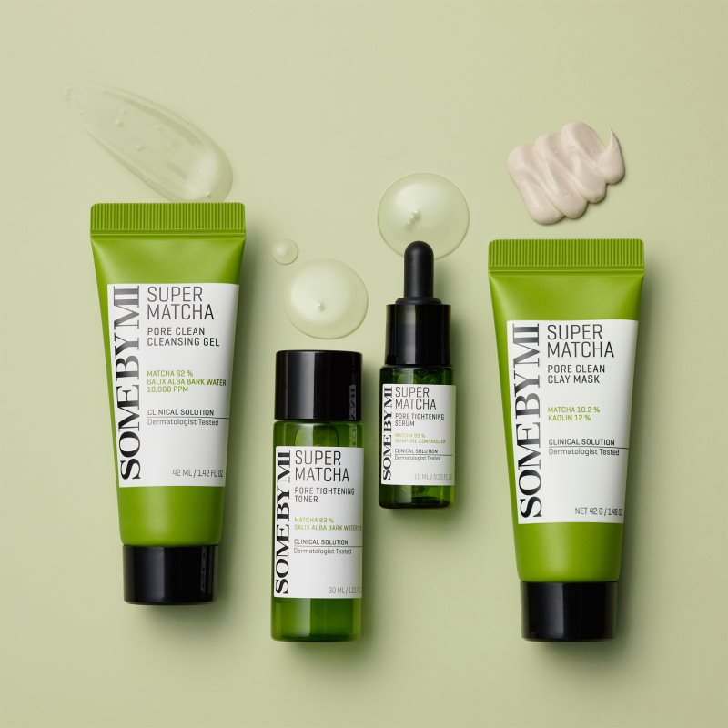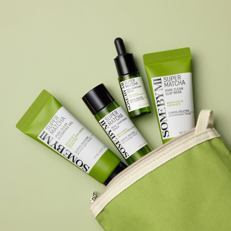 Some By Mi Super Matcha Pore Care, Čisticí masky pro ženy, Vše pro krásně vypadající pleť v jednom balení. Kosmetická sada Some By Mi Super Matcha udělá radost vám nebo jako dárek potěší vaše blízké. Sada obsahuje: zklidňující sérum proti lesknutí pleti a rozšířeným pórům 10 ml tonikum pro redukci rozšířených pórů 30 ml čisticí jílová pleťová maska pro stažení pórů 42 g jemný čisticí gel na rozšířené póry 42 ml Vlastnosti: mix kosmetických produktů pro každodenní použití obsahuje miniverze produktů pro ošetření a regeneraci pleti ideální na cestování pro problematickou pleť pro důkladné vyčištění pleti absorbuje přebytečný kožní maz uvolňuje nečistoty v pórech a stahuje je Jak používat: Každý produkt z kosmetického setu používejte dle jeho návodu.