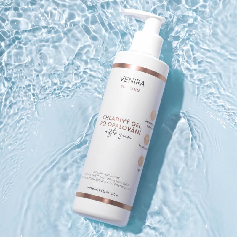 Venira Chladivý gel po opalování, 250 ml, Přípravky po opalování unisex, Aby pokožka vašeho těla netrpěla kvůli pobytu na slunci, je důležité o ni pečovat nejen před sluněním, ale i po něm. Přípravek po opalování Venira Chladivý gel po opalování se postará o celkové zklidnění a doplnění ztracené vlhkosti, pomůže pokožce regenerovat se a přispěje k redukci zarudnutí. Vlastnosti: hloubkově vyživuje pokožku navrací pokožce pružnost dodává pocit svěžesti lze použít na obličej i tělo má chladivý efekt okamžitě pokožku zklidňuje snižuje pocity pálení Složení: obsahuje minimálně 99 % složek přírodního původu dermatologicky testováno veganský produkt Jak používat: Naneste rovnoměrně čistou pokožku po vystavení slunečnímu záření. Nechte vstřebat, neotírejte.
