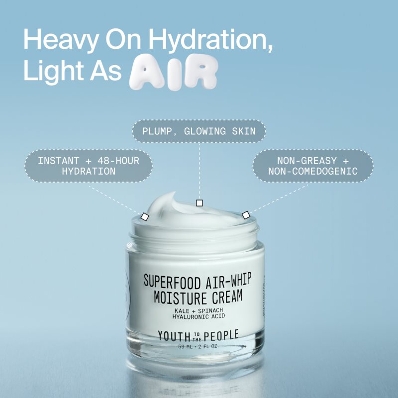 Youth To The People Superfood Air-Whip Moisture Cream, 59 ml, Péče o pleť unisex, Nechcete podcenit péči o pleť? Používejte každý den hydratační krém – je to základ péče o pleť, bez kterého se běžná kosmetická rutina neobejde. Pleťový krém Youth To The People Superfood Air-Whip Moisture Cream dodá pleti potřebnou dávku hydratace, přinese úlevu od pocitu suchosti a zabrání tvorbě šupinek. Zanechá pleť v rovnováze, zvláčněnou, vyživenou a hebkou. Jeho hydratační účinky navíc pomůžou i v boji proti známkám stárnutí pleti. Vlastnosti: rychle se vstřebává hloubkově vyživuje regeneruje a vitalizuje sjednocuje tón pleti navrací pleti pevnost a zanechává ji vypnutou regeneruje kožní bariéru
